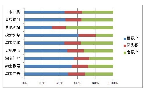 從上述圖表中,我們可以看到賣家一周內(nèi)的新客戶、回頭客、老客戶都是從不同的來(lái)源進(jìn)入網(wǎng)店的?;蛟S因搜索排名、口碑、品牌、商品展示等因素影響了消費(fèi)者的首次購(gòu)買行為。細(xì)心的朋友會(huì)發(fā)現(xiàn),在上表中,回頭客、老客戶是店鋪流量的主力軍,但他們的來(lái)源又各不一樣,從其他網(wǎng)站、商城、直接訪問(wèn)、買家中心來(lái)的老顧客占得較多,而且質(zhì)量也比較高。